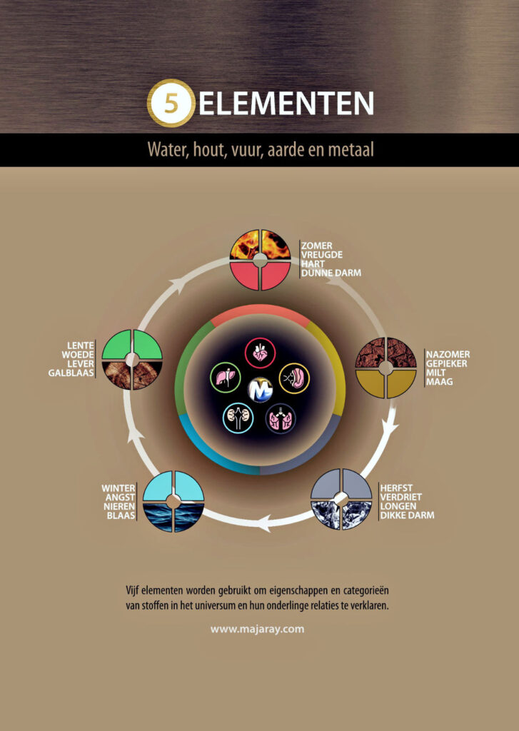 In de Traditionele Chinese Geneeskunde (TCM) vormt de leer van de vijf elementen (Wu Xing), een essentieel kader om de samenhang tussen de natuur, het lichaam en de geest te begrijpen. Elk element vertegenwoordigt een specifiek aspect van het leven en weerspiegelt hoe energie, of qi, zich in en om ons heen beweegt. Het element hout symboliseert groei, beweging en vernieuwing. Het wordt geassocieerd met de lever en de galblaas, en met de ogen als bijbehorend zintuig. Wanneer de energie van hout in balans is, ervaart u een natuurlijke stroming in uw leven en kunt u flexibel reageren op veranderingen. Onbalans kan zich uiten in frustratie of woede. Hout hoort bij de lente, het seizoen van ontluiking en wind, en wordt gekenmerkt door de kleur groen en de zure smaak. Het element vuur vertegenwoordigt warmte, vreugde en vitaliteit. Het regeert over het hart, de dunne darm, het pericard en de drievoudige verwarmer, met de tong als zintuiglijk orgaan. Een harmonieuze vuur energie uit zich in enthousiasme, liefde en verbinding; een overmaat kan leiden tot rusteloosheid of overmatige opwinding. Dit element hoort bij de zomer, bij hitte en bij de kleur rood, met de bittere smaak als kenmerk. Aarde staat voor stabiliteit, voeding en verzorging. Het is verbonden met de milt en de maag en met de mond als zintuig. Wanneer uw aarde element sterk is, voelt u zich gecentreerd en kunt u informatie en voeding goed verteren – zowel fysiek als mentaal. Overmatig piekeren kan de balans echter verstoren. Aarde correspondeert met de late zomer, met vochtigheid en de kleur geel, en heeft een zoete smaak. Het element metaal brengt structuur, helderheid en de kracht om los te laten. Het beïnvloedt de longen en de dikke darm en staat in verbinding met de neus. Metaal is het element van de herfst, het seizoen waarin de natuur zich terugtrekt. Wanneer dit element in evenwicht is, kunt u verdriet verwerken en nieuwe ruimte creëren; wanneer het verzwakt is, kan melancholie overheersen. Metaal hoort bij de kleur wit, bij droogte en bij de pikante smaak. Tot slot vertegenwoordigt water de diepte, rust en wijsheid. Het regeert over de nieren en de blaas en is verbonden met de oren. Een gezonde Water energie geeft u veerkracht, innerlijke kracht en vertrouwen, terwijl onbalans zich kan uiten in angst of uitputting. Water correspondeert met de winter, de kou, de kleur blauw of zwart en de zoute smaak. De vijf elementen vormen samen een dynamisch geheel waarin elk element het volgende voedt in de zogenaamde voedingscyclus: Hout voedt vuur, vuur schept aarde, aarde vormt metaal, metaal verrijkt water, en water voedt opnieuw hout. Tegelijkertijd houden de elementen elkaar in balans via de controlecyclus, waarin ieder element een ander in toom houdt om harmonie te bewaren. Wanneer deze cycli in evenwicht zijn, stroomt uw energie vrij en ervaart u zowel lichamelijke als emotionele balans. Dit samenspel van de vijf elementen vormt de kern van gezondheid volgens de Traditionele Chinese Geneeskunde.